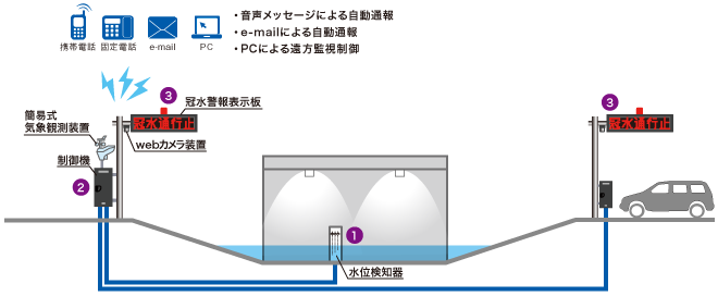 水位検知器で冠水信号(注意レベル、危険レベル)を検知します。 - 受信・制御・通報