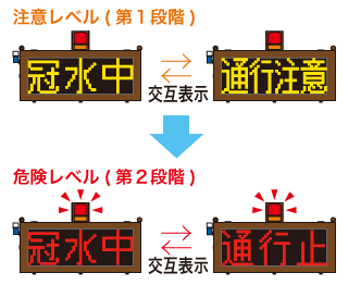 水位検知器からの冠水信号を検知すると、水位レベルに応じた表示を冠水警報表示板に制御します。また同時に使用回線に応じた手段にて音声メッセージやe-mailで自動通知します。多彩なオプションにより、停電補償の実装やウェブカメラ、簡易式気象観測装置の接続が可能です。 - 注意喚起表示