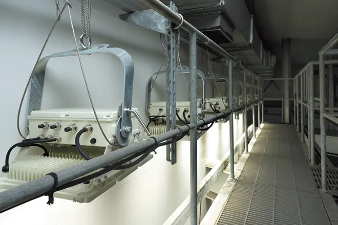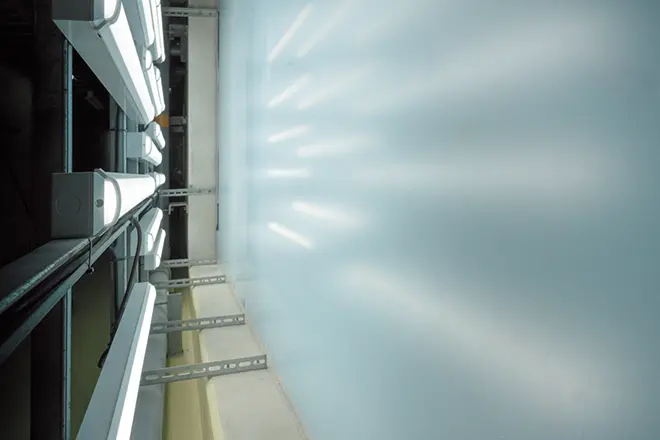 しものせき水族館 海響館では、施設・設備の大規模改修工事を行い、新たな魅力の創出としてアシカの展示繁殖施設「ひれあしビーチ」も加わり、2025年8月にリニューアルオープンしました。下関市が掲げる「ゼロカーボンシティしものせき」の方針に基づいた改修工事の一環として、「関門海峡」水槽や「イルカスタジアム」、フグ、クラゲ、アマモの水槽や「瀬戸内海」水槽などに岩崎電気のLED照明器具をご採用いただきました。LED化にあたっては、生き物がもつ本来の美しさを引き出しながら、館全体として快適な鑑賞環境を両立することを目指しました。基本的には既設照明の1対1交換によるリニューアルで、極力既存の取付位置をいかしつつ、光の方向性や照度バランスを再設計しています。
