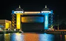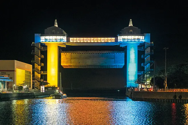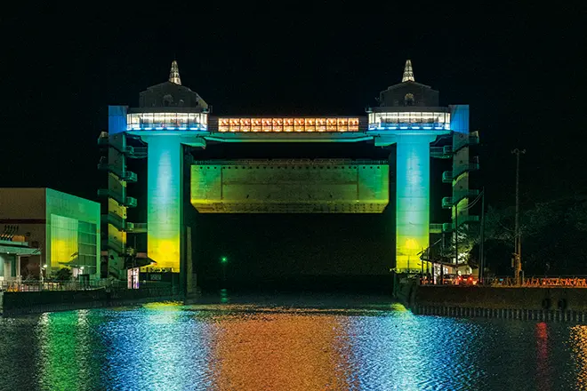沼津港のシンボルとして親しまれている大型展望水門をより魅力的に照らす多彩な光の演出