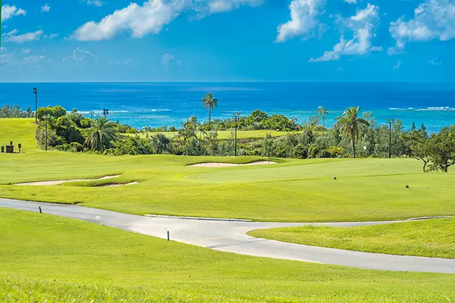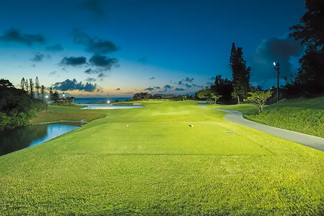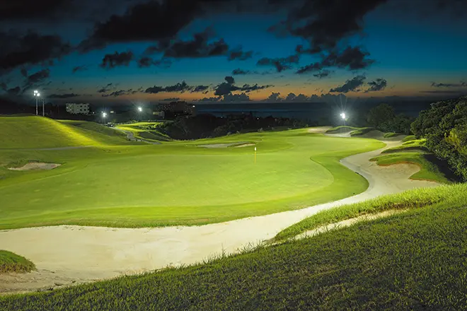 PGMゴルフリゾート沖縄は、眼下にエメラルドグリーンに輝く東シナ海を見下ろす丘陵地にあり、はるか本部半島や伊江島を見渡せる壮大な景観が魅力のゴルフ場です。青木功プロのコース改造・監修により、さらに戦略性が高まった3コース(ハイビスカス、デイゴ、ブーゲンビレア)全27ホールを擁するチャンピオンコースで、プロゴルフトーナメントも開催されてきました。また、2023年からゴルフを通じた社会貢献を目的とした男女ペアマッチ大会「HEIWA・PGMチャリティゴルフ」を毎年開催しています。2026年にはゴルフ場に隣接して「PGMホテルリゾート沖縄」もオープンする予定です。PGMゴルフリゾート沖縄では、2024年8月より、沖縄県内では初となるチャンピオンコース18ホール(ハイビスカスコース、ブーゲンビレアコース)のナイター営業を開始しました。