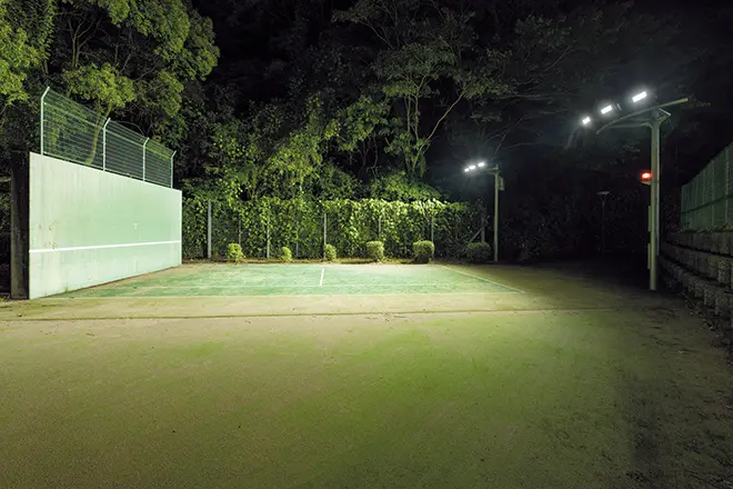 宇和島市では、2024年4月に、多目的グラウンドと南庭球場のナイター照明をLED化する工事を実施しました。サッカーやグランドゴルフなど各種球技に使用されている多目的グラウンドは500人収容可能の観客席も備え、各種公式戦も行われています。今回のLED化については、既設HID投光器に替えてLED投光器「レディオック フラッド デュエル 800Wタイプ」をご採用いただき、各種競技の練習試合やトレーニングに十分な維持平均照度200ℓxを満足する設計としました。一方、全天候型人工芝テニスコート6面を備えている南庭球場では、既設照明設備に替えて屋外テニスコート用LED照明器具「レディオック テニスター 400クラス」をご採用いただきました。維持平均照度300ℓxを確保し、テニスボールの早い動きにも対応した設計とすることで、夜間も安心してプレーを楽しんでいただける視認性の高い照明環境を整えています。さらに、LED投光器「レディオック フラッド アヴァン 150クラス」で壁打ち練習コート1面を効率よく照ら出し、夜間も快適な練習が可能となりました。