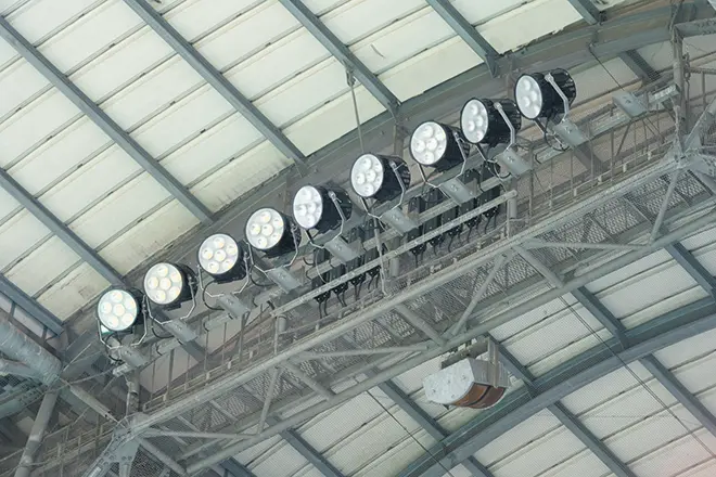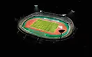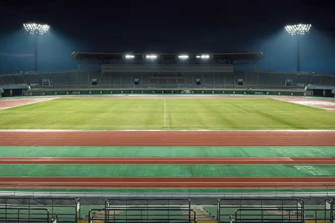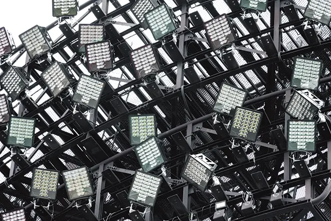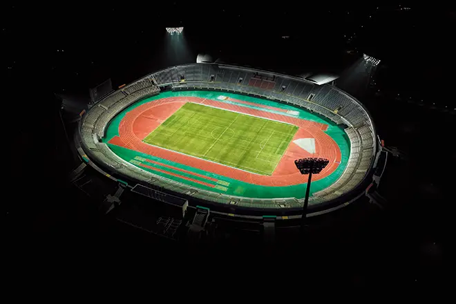 埼玉県では、2025年3月、陸上競技場の照明設備改修工事を実施し、既設HID投光器をLED照明に更新しました。近隣に住宅地や農作業地があることから、特に光害に配慮のうえ、4基の照明鉄塔にはLED投光器「レディオック フラッド アヴァン 光害対策形 1300クラス」をご採用いただきました。上空や周囲への漏れ光を抑制しつつ、競技に適した良好な照明環境を提供しています。また、スタンド上にLED投光器「レディオック フラッド デュエル 1500Wタイプ」を設置して陸上競技場を明るく照らし、十分な照度を確保しています。照明設計にあたっては、3DCGと照明環境シミュレーションシステム「iVR-360」を活用し、VR空間上でスタジアム内と近隣の住宅からの明るさ検討を行い、イメージ共有の促進を図りました。さらに、LED投光器と建築との干渉、影の出方や遮光などを「iVR-360」で事前に検証を行うことにより、施工時に設計通り進行することを可能にし、照度測定により要件を満たしていることを確認できました。また、高出力の器具を使って台数を削減して器具同士の間隔をあけ、クロスエイミングを行うことで、照明鉄塔を直接見た際にまぶしく感じる光の塊ができにくいように配慮しています。