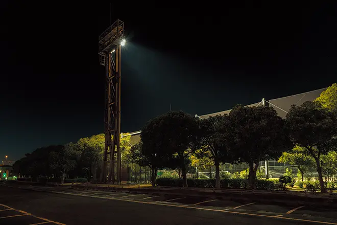 横浜市では、2024年3月に運動広場のナイター照明設備をLED化する改修工事を実施しました。この運動広場は、野球だけでなく、サッカーやラグビーなどの多目的利用が可能な施設です。LED化にあたっては、緑豊かな自然に恵まれた周辺環境のほか、隣接する高速道路や住宅地に配慮し、上空や周辺への漏れ光を抑えながら快適なプレー環境を確保することが重要課題でした。これらの条件を満たす照明として、周辺環境への配慮とプレーしやすい照明環境を両立する「光害対策形 LED投光器」をご採用いただきました。既設鉄塔を活用して投光器のみをLEDに更新し、省エネ推進と質の高いナイター照明環境を実現しています。