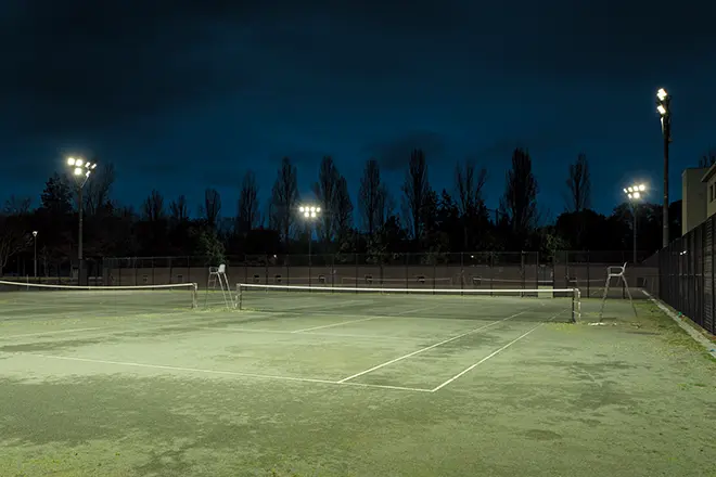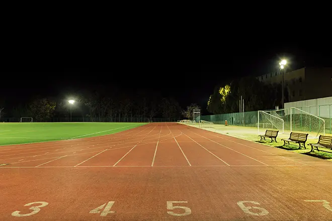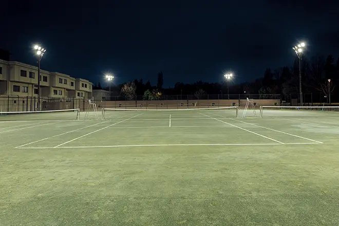 立正大学では、水銀ランプの製造・輸入禁止やHIDランプ製造終了といった社会的動向への対応、また、CO₂排出量削減、省エネ推進、省メンテナンスなどの観点から、大学内の建物や屋外スポーツ施設の照明LED化を段階的に進めてきました。その一環として2025年2月に、陸上競技場とテニスコートの夜間照明LED化工事を実施しました。サッカー場、ラグビー場についてはすでにLED化を完了しており、今回の照明改修をもって、熊谷キャンパスにあるナイター照明設備を備えた全ての屋外競技施設でLED化が完了しました。陸上競技場、テニスコートの照明更新に際しては、既設のHID照明と同等以上の明るさを確保することに加え、まぶしさが競技の妨げにならない照明環境となることを重視し、高効率形LED投光器「レディオック フラッド アヴァン 400クラス」を採用しました。過去に行ったLED化工事では、コーチや学生より「まぶしい」、「照度にむらがある」といった指摘が一部から寄せられたことも踏まえ、特にグレアの抑制や光の均斉度に配慮した照明設計を求めました。今回はLED照明に更新後、以前に比べて明るくなり、見やすさについても大きな問題はないとの評価をいただいています。電気代の削減にも貢献するLED照明で、夜間も日々の練習に集中できる快適な照明環境をつくることができたと考えています。
