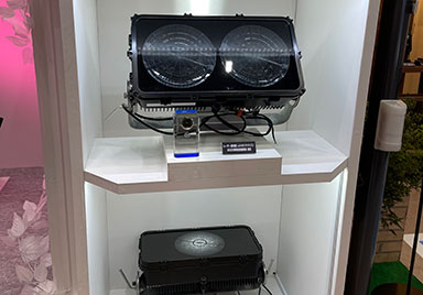 下に見えている器具は、展示会用に出力を抑えたデモ機で、ビッグサイトの天井まで細いまっすぐな光が伸びていました。