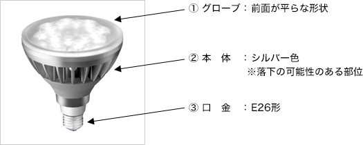 さて、弊社が2011(平成23)年9月から2013(平成25)年7月までに製造販売いたしましたLEDアイランプ ビーム電球形18W、E26口金の下記製品におきまして、放熱を妨げる形状のダウンライト器具との組み合わせによる使用温度上昇の影響によって、口金樹脂成型部で微小クラック(ひび割れ)が発生し、極めてまれにランプが不点灯・破損・落下する可能性のあることが判明しました。