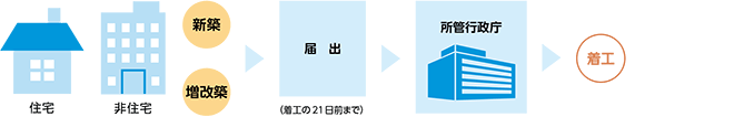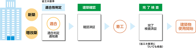 建築主は一定規模以上の建築物の新築・増改築をしようとする場合、その用途や規模等に応じ省エネ基準に適合していることの所管行政庁等による判定(適合性判定)や、所管行政庁への届出などが必要となります。