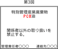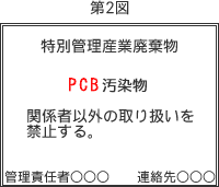 - 廃PCB等及びPCB汚染物を収納した容器には、見やすい箇所に耐久性のある材質のものを使用して第2図又は第3図に示す表示をしなければならない。