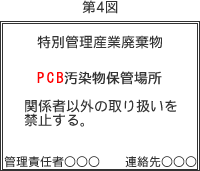 - 使用済みPCB使用電気機器、廃PCB等及びPCB汚染物の保管施設には、見やすい箇所に耐久性のある材質のものを使用して、第4図に示す表示をしなければならない。