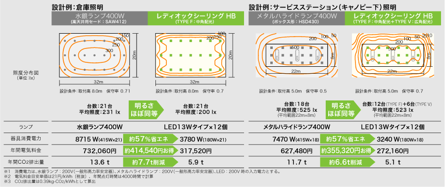 高出力LEDと優れた器具設計により、最高器具光束13800ℓm (シリーズ最高値)を実現し、当社従来品メタルハライドランプ400Wと比較した場合、同等の明るさで、CO₂排出量・器具消費電力を約57%削減可能です。