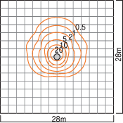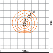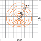 照明器具取付高:2.8m、保守率:1.0 - ※曲線上の数値は初期水平面照度を示す。(単位:ℓx)