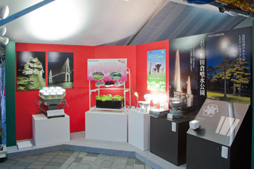 今回は、愛の泉ステージのとなりに専用ブースを設置し、「LED植物育成システム」や「皇居外苑の演出照明」、普段目にすることのできない大型LED投光器「LEDioc FLOOD BLITZ(ブリッツ)」をご覧いただきました。
