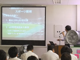 午前の部のセミナーは、スポーツ照明について、JIS規格の変更を説明し高出力形LED投光器「LEDioc FLOOD DUELL」を紹介。