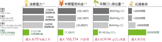 - ※2 電気料金目安単価は21円/kWh(税抜)、年間点灯時間は4000時間で計算