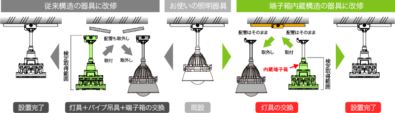 当社防爆形HID照明器具から、器具のみの交換を可能にする端子箱内蔵構造。既設の端子箱をそのまま利用できるため、配管工事が不要となり、改修工事を大幅に省力化します。