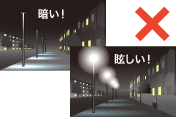 このような環境で光の広がりや輝きを抑制し、路面だけを照明すると、歩行者へ与える不安感は改善されません。 また、LED街路灯の発光部が眩しいと、輝度対比により、周辺や路面がより一層暗く感じてしまいます。