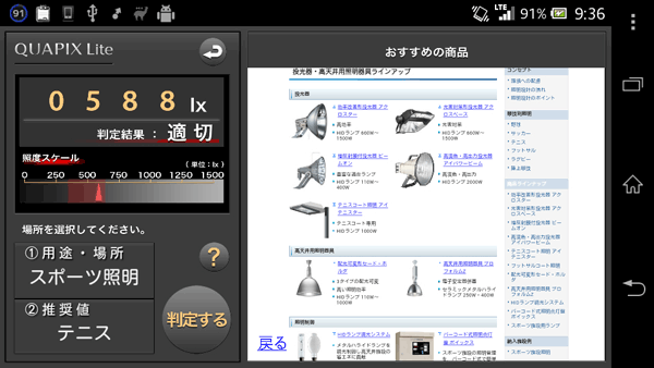 「照度」なら、シーン(用途・場所)を選んで判定を行います。測定位置の照度「○○ℓx(ルクス)」の表示※とともに、推奨照度と比較して「明るい」「適切」「暗い」の3段階で評価をお知らせします。
