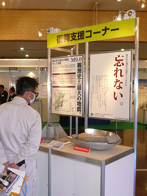 照明展示とあわせて「復興支援コーナー」を設置。「復興支援コーナー」では、震災時のパネル展示(国土交通省 東北地方整備局より提供)と併せて、災害時にスマートフォンやタブレットに充電できるLED太陽灯やソーラー式避難誘導灯などの防災機器を関連企業と合同展示しました。
