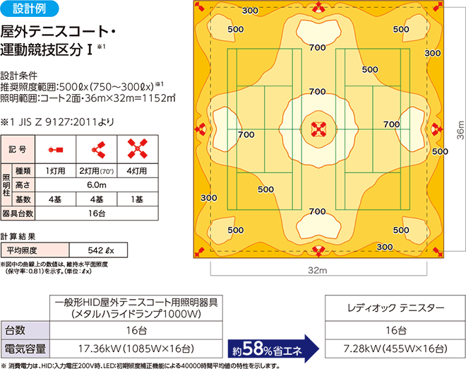 - ※1 形式:屋外テニスコート専用HID器具アイ テニスターH8160、ランプMT1000B/BH