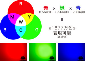各256階調の赤×緑×青を組合わせることで約1677万色を表現することが可能です。