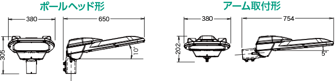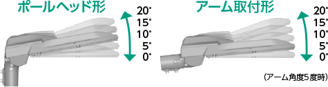 ポールヘッド形・アーム取付形のどちらも灯具設置時・設置後の角度調整が可能です。