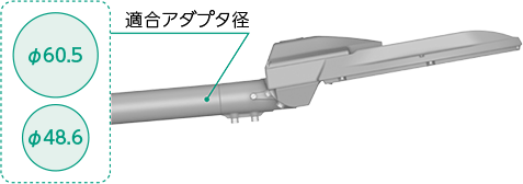 ポール嵌合部のアダプタ径は、標準のø60.5径に加え、ø48.6径・既設ポールにも取り付け可能です。