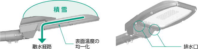 積雪地域では灯具部に氷柱(つらら)が形成される場合があり、当該品は、点灯時の熱で解けた灯具上の雪解け水を灯具下部の排水口より灯具外へ流し、氷柱形成の抑制※を考慮した灯具設計です。