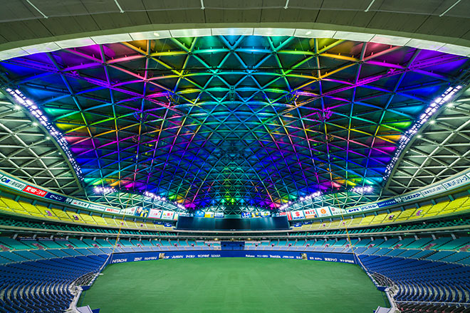 フルカラー照明も含めたスタジアム全体で光演出が可能なDMX制御(DMX512-A※1)による照明システムで、ドーム球場として日本初となります。設計・施工は株式会社竹中工務店(電気設備工事は株式会社トーエネック)。