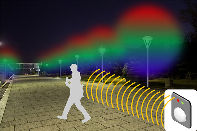 従来のスケジュール点灯に加えて、センサ(人感センサ、温度センサ)やスマートスピーカー、SNSなどのサービスと連携した照明制御が可能です。 また、ウェブサイトをサーチし、掲載情報を利用してインタラクティブに照明を変化させることもでき、従来では難しかった多様な照明演出も実現できます。