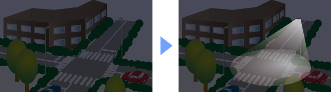 夜間停電時の交差点イメージと、LEDioc ANSEEN設置後のイメージ