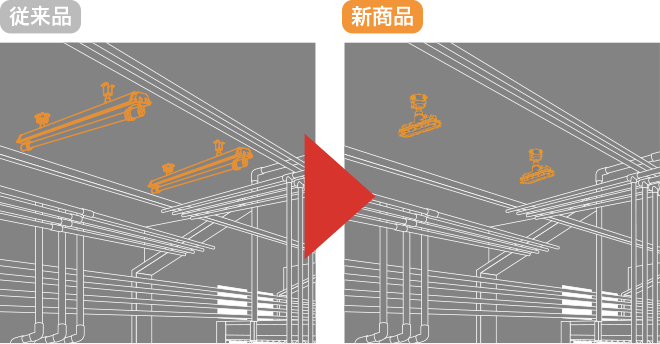 器具が小さいため、省施工であり、従来品では設置が難しかった配管の隙間や狭い通路などに設置可能です。また補助光源としてピンポイントで使用できるほか、ベースライトとしても使用可能です。