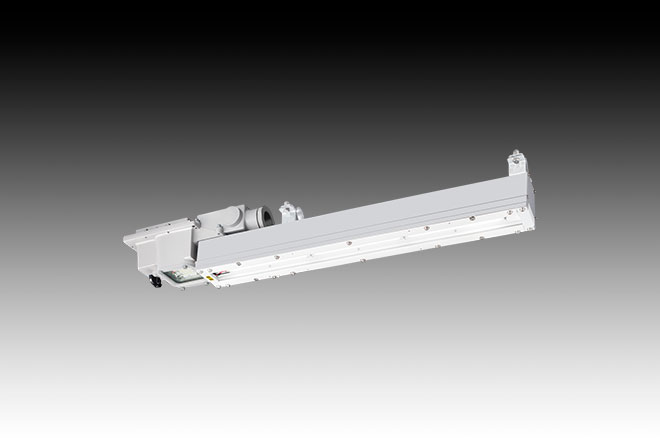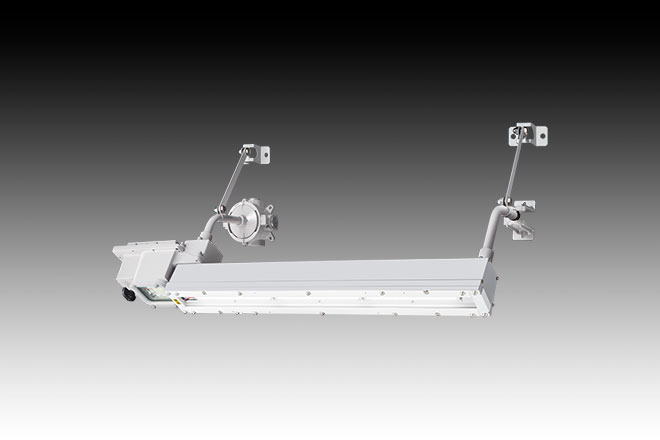 常用照明と非常照明の両立を図りながら、従来品以下のコンパクト設計。器具全長は1075mm、器具質量は15.4kg(直付形)です。従来の安全増防爆形非常用蛍光灯(EYHFSA1425EFU9-22 全長1345mm、質量15.6kg)と比較して約20%のサイズダウンを実現。光源一体形のため、ランプ交換スペース不要で壁際でも設置可能です。