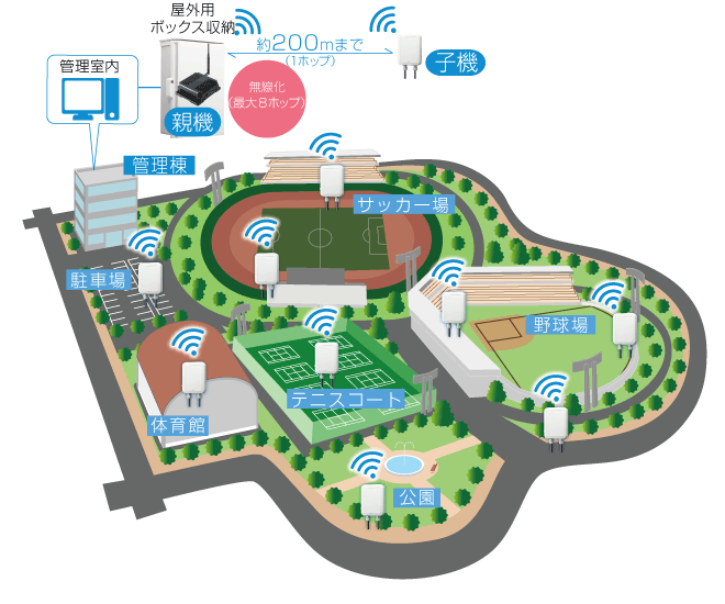 スポーツ施設照明制御システムの当社のバーコード式照明点灯盤「BOIQS(ボイックス)」に、「ワイ コネクティ」子機を内蔵することで、新たに制御線を設置することなく施設ごとの照明ON/OFFが可能になります。