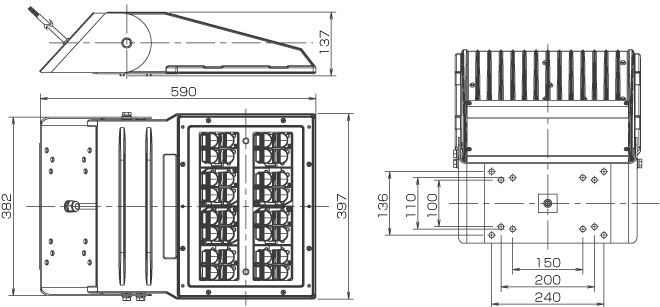 従来HID照明器具※1と比較して受圧面積比53%の小形化(0.128m²→0.060m²)、質量比で43%の軽量化(27.4kg→15.5kg)を実現しました。