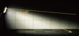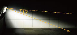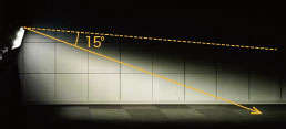 光害対策ガイドラインでは、指定された方向への最大光度を2500cd以下、最大鉛直面照度を2ℓxとしており、基準軸(器具中心)より上方15°の実光度を2500cd以下に設定しています。