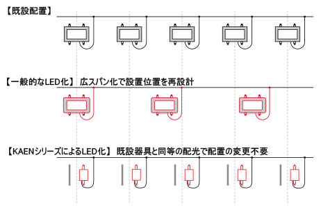 一般的なLED化では、新しい器具に合わせた照明設備設計や、広スパン化による配置位置の変更、取付金具や配線ケーブルなどの更新、アンカー工事など工期や費用などの多くの負担が必要でした。