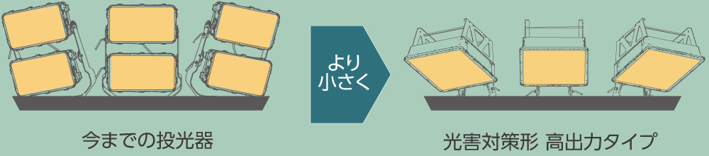 この度ラインアップした高出力タイプは業界最高レベル※2の器具光束188000ℓmと漏れ光対策を両立し、高出力化により設置台数を削減でき、均斉度の高い照明設計を可能にした優れた配光性能で、大規模屋外スポーツ施設照明に適したLED投光器です。