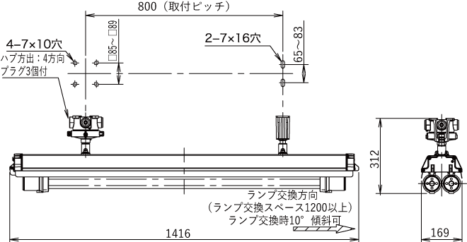 - 防爆形蛍光灯と同様の取付寸法でLED化への更新が容易。