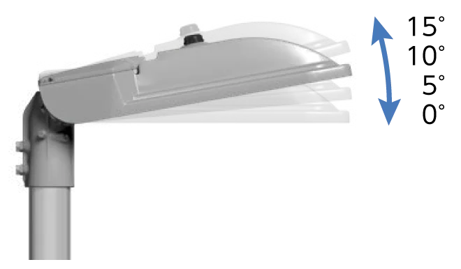 設置後に車線拡幅やポール仕様が変更となった場合でも、灯具側でフレキシブルに対応することができます。(0°、5°、10°、15°)