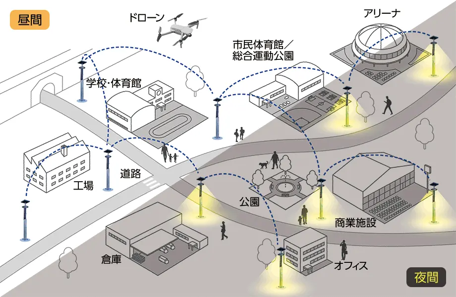 直流LED照明を採用することで、エネルギー効率を高め、街を照らす照明とドローン用無線給電ステーションとして、通常時・非常時ともに変わらない光環境の提供及びドローンによる災害時などのインフラ監視・確認が可能となります。