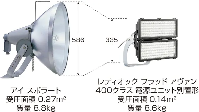 HID投光器との比較では、受圧面積を49%削減し、既設照明柱などへの負担を軽減できます。
