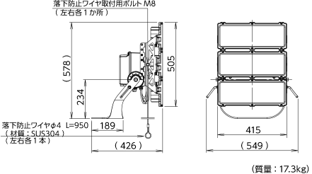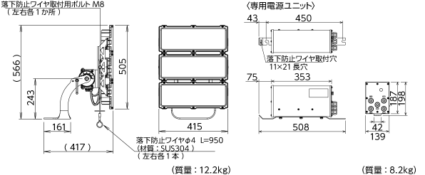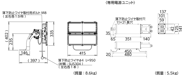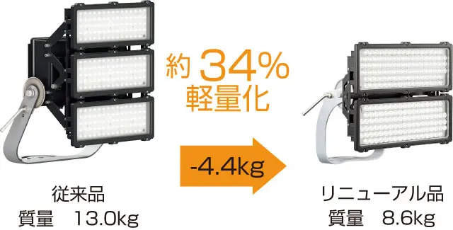 ご好評の従来品イメージを踏襲しつつ、更なるコンパクト設計で、HID投光器と同等以下の質量となる8.6㎏(400クラス電源ユニット別置形)と大幅な軽量化を実現しました。