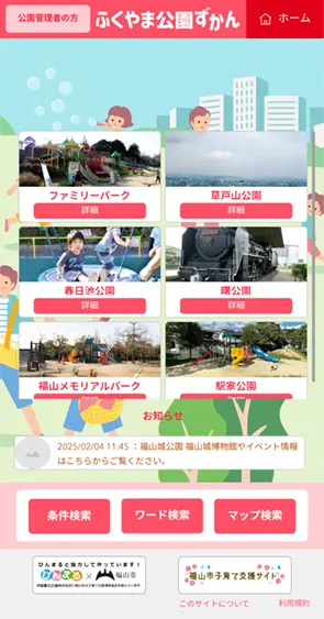 「ふくやま公園ずかん」は、福山市公園施設デジタル化事業の一環で、市内屋外照明器具管理のために岩崎電気が独自開発したシステムを活用しており、PCやスマートフォンからご利用いただけます。