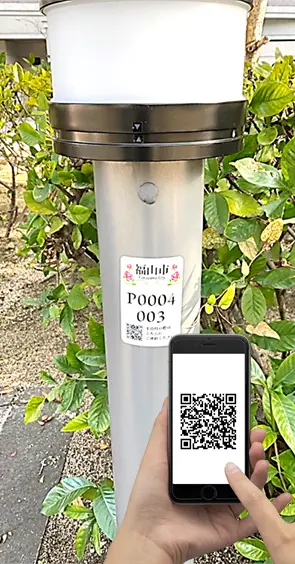 常時の管理者による照明器具の状況把握のほか、設置位置からの照明器具の不具合、暗くなっても点灯しないなどを見つけたらQRコードの読み取りで、該当の公園や照明器具を市役所に通知できます。