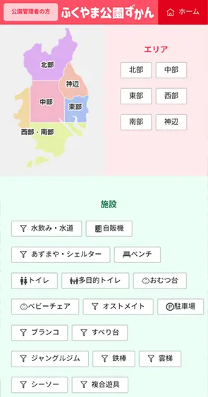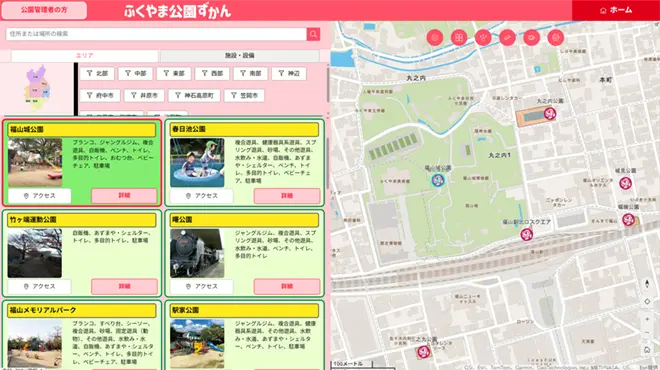 一般利用者が、地域やおすすめ条件で検索でき、公園の紹介情報や、アクセス情報も入手可能。