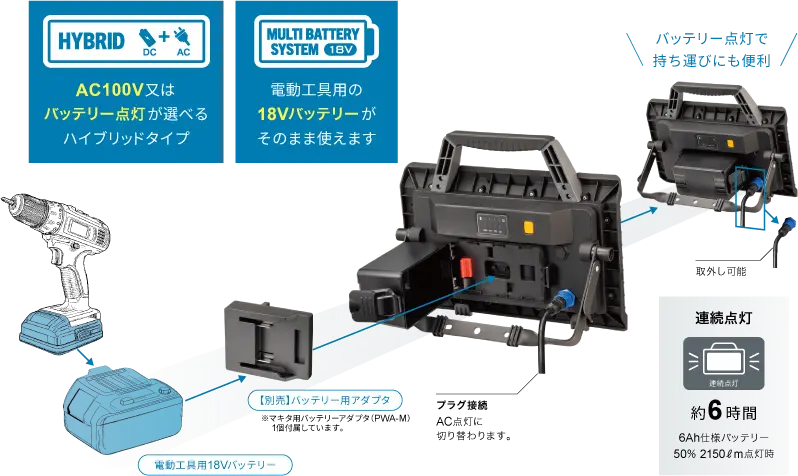 本商品は、AC100Vのプラグ付きで配線工事不要、プラグ接続又はバッテリー点灯が選べるハイブリッドタイプで、電動工具用の18Vバッテリーがそのまま使えます。