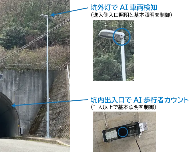 本システムは、脱炭素社会の実現に向けた取組みとして、高効率なLED照明の交換・導入に加えて、電力消費量をより一層削減するため、トンネルを通行する車両及び歩行者の存在を画像処理で検知し、通行時は所要の路面輝度を確保し、未通行時は減光運用を図るものです。