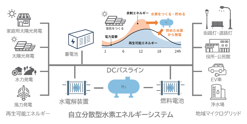 そして岩崎電気株式会社では、再生可能エネルギーを利用した地域自立分散型エネルギーシステムや、直流機器デバイス(太陽電池、蓄電池、水電解、燃料電池、照明など)を直流でつなぐ直流給電システムなど、地域エネルギーの効率的利用に向けた開発に取り組んでいます。