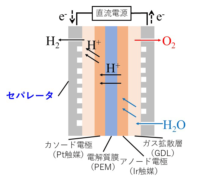 固体高分子(PEM)型水電解は、固体高分子膜(PEM)を用いて水を電気分解する水素製造方法。